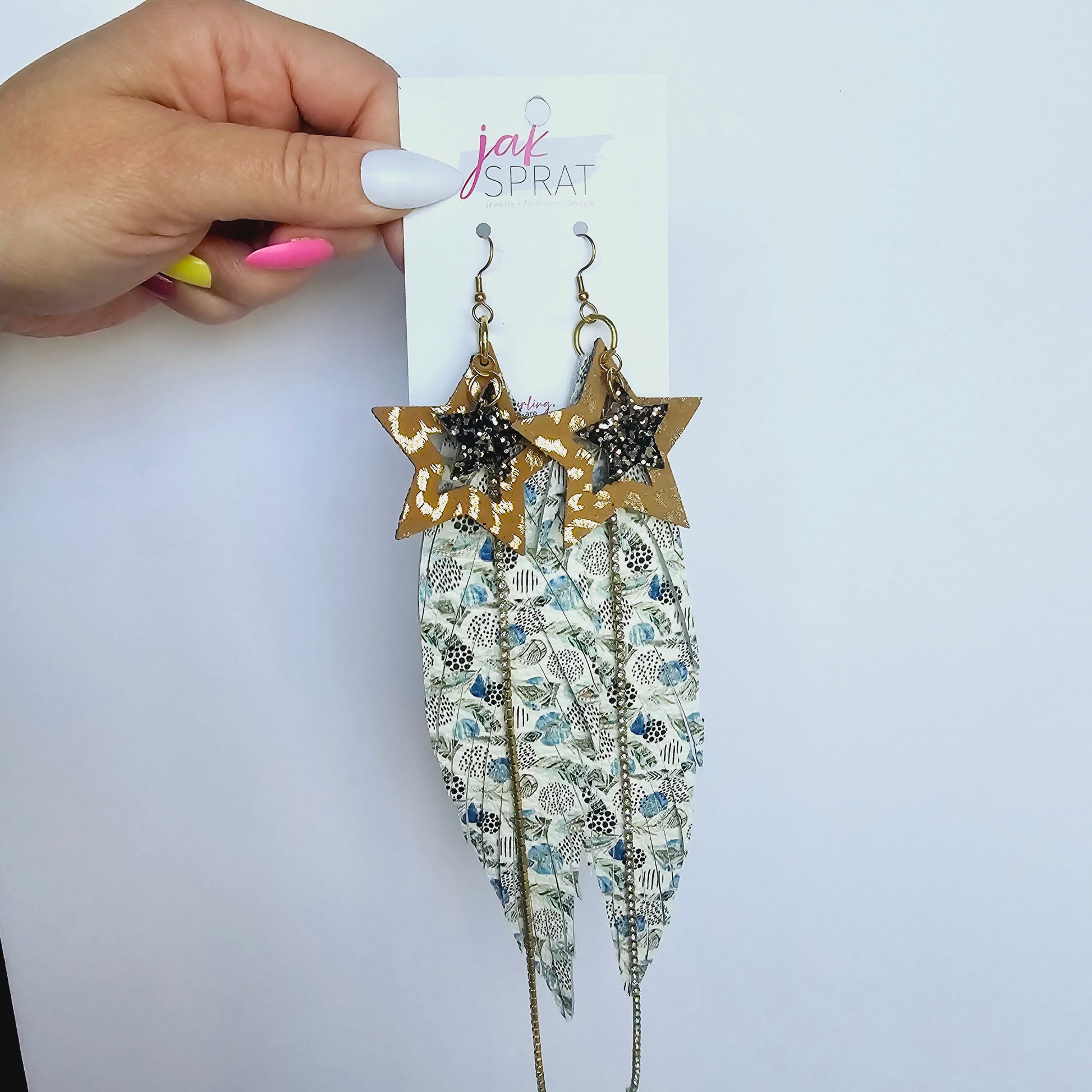 Step up your earring game with our SHOW GIRLS style collection, the for those who love JAK Sprat one-of-a-kind styles- that you probably won't see again. Each pair is crafted with a mix of leather and faux leather for a lightweight, yet bold look. Whether you're going for playful or chic, these earrings are sure to make a statement wherever you go.