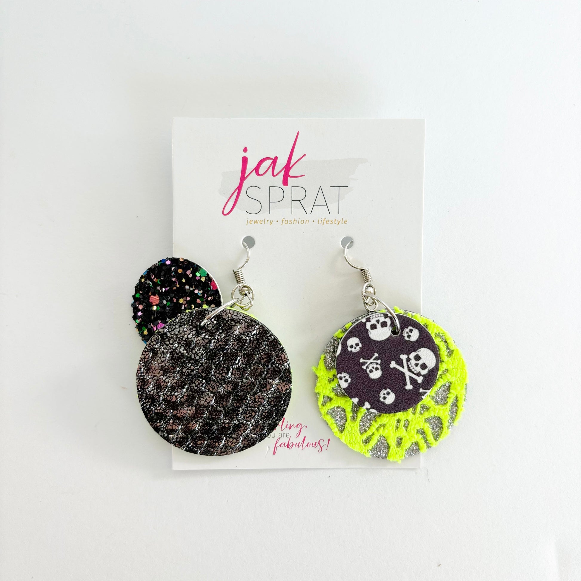 All earrings pictured are fun and fabulous! Our earrings are made with leather and faux leather. All hooks are hypoallergenic, but because we’ve learned all ear sensitivities are different, we cannot make any guarantees to your ears specifically.